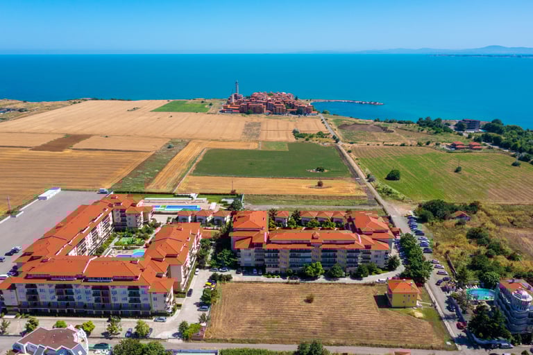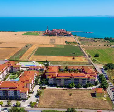 Der Komplex Chateau Aheloy 2 befindet sich in ruhiger und malerischer Lage am südlichen Rand des beliebten Ferienortes Aheloy, nur etwa 400 Meter vom feinsandigen Strand entfernt. Eingebettet in eine grüne Umgebung mit Meerblick, bietet die Wohnanlage ein entspanntes, naturnahes Wohnambiente und gleichzeitig eine hervorragende Anbindung an die städtische Infrastruktur