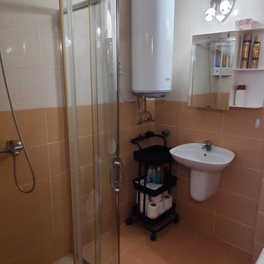 Die Wohnung besteht aus einer Wohnküche, einem Schlafzimmer, Bad mit Dusche und WC und einem Balkon mit Blick Stadtblick und Weitblick auf das Meer.